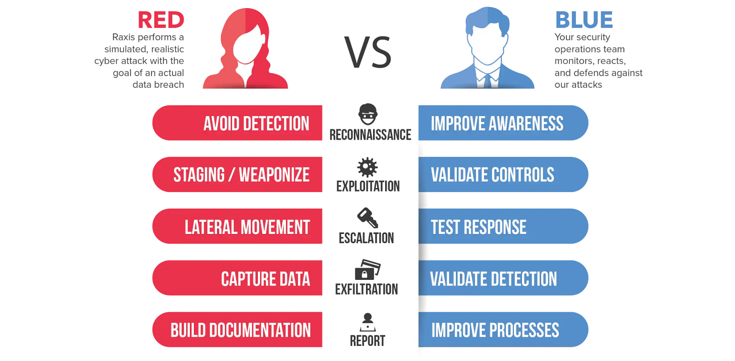 Trong nhiều tổ chức, hoạt động này được tổ chức thành hai vai trò rõ ràng: Red team và Blue team.