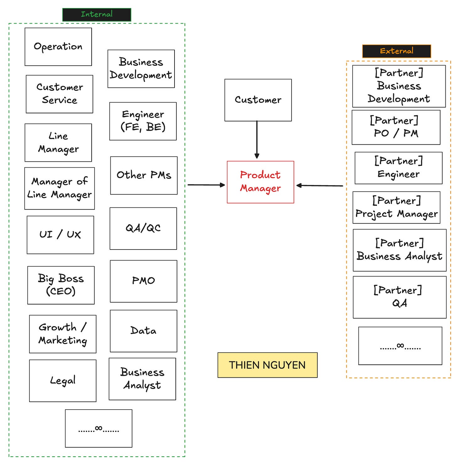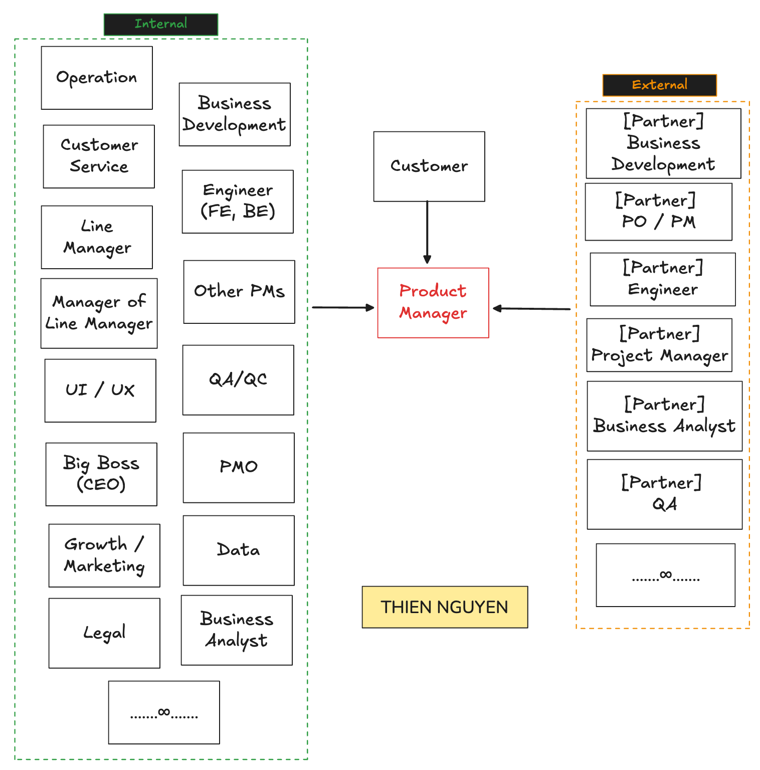Nhưng làm Product thì khác hẳn. Nhìn lại sơ đồ stakeholder này mới thấy, PM đứng đúng ngay tâm điểm của mọi luồng giao tiếp. Từ internal tới external, từ business tới tech, từ operation tới leadership. Ở đâu cũng có mặt mình. Và lúc đó mình mới hiểu rõ một điều: để Product làm feature, phải làm việc với rất nhiều rất nhiều con người với rất nhiều góc nhìn khác nhau.