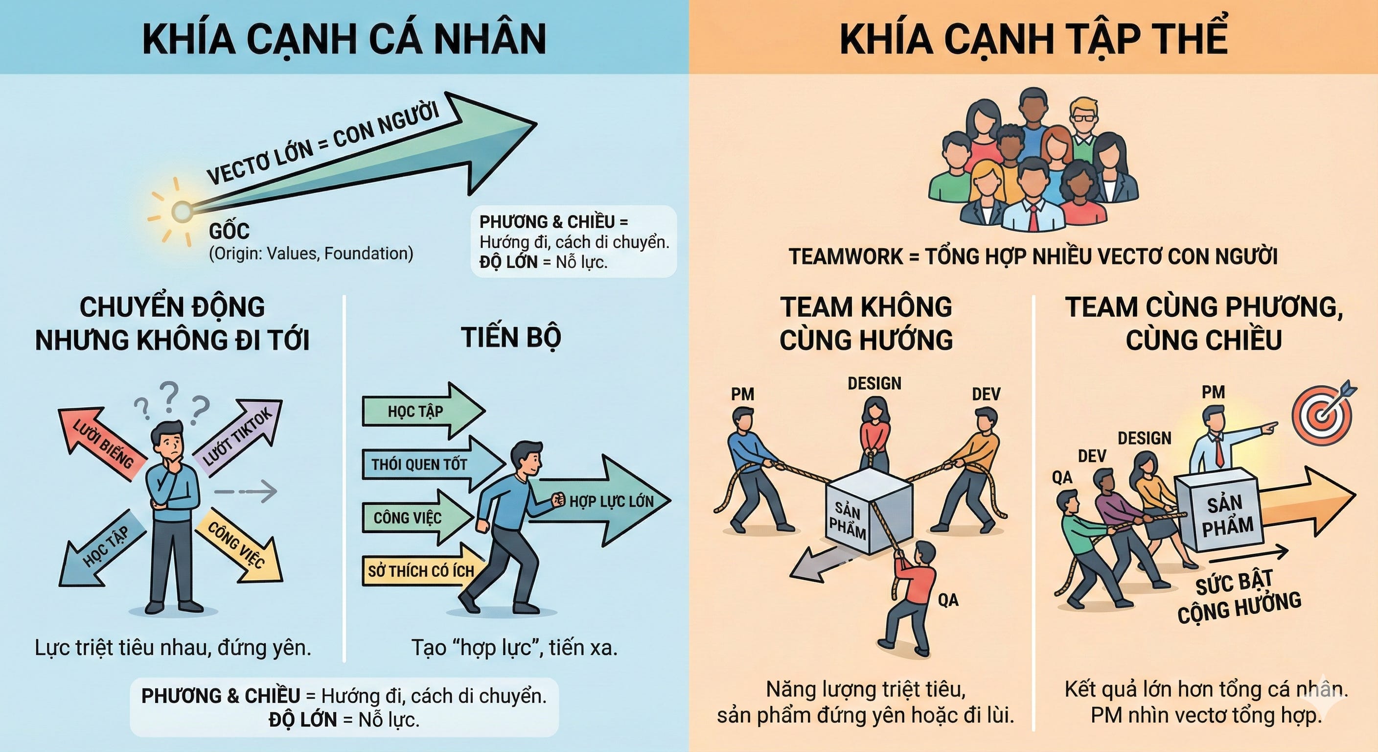 Nếu xem mỗi người chúng ta như một vectơ lớn, thì mọi hành động (việc học, thói quen, lựa chọn, sở thích, công việc) đều là những vectơ nhỏ góp lực vào tổng hợp đó.
